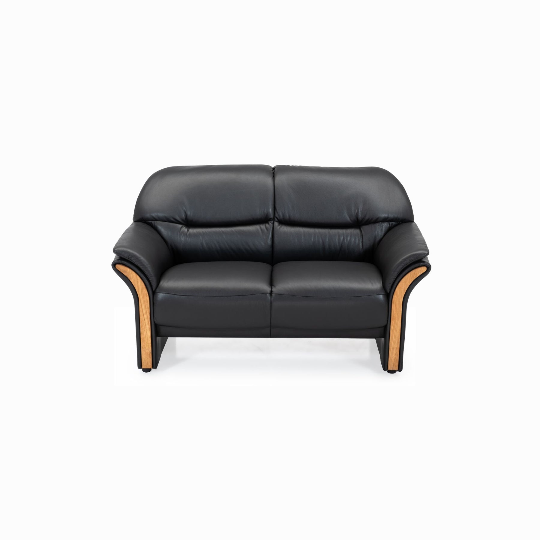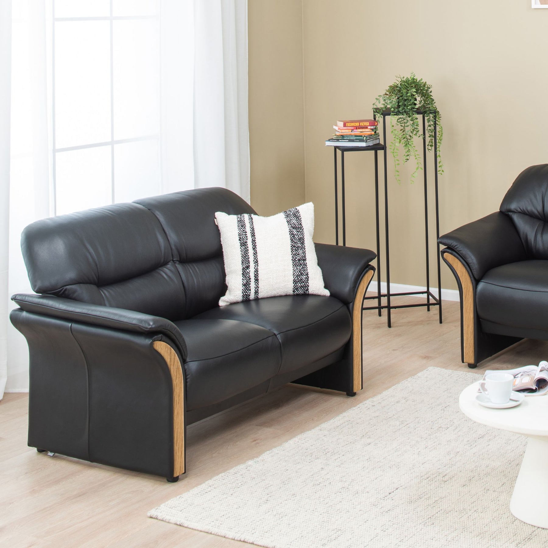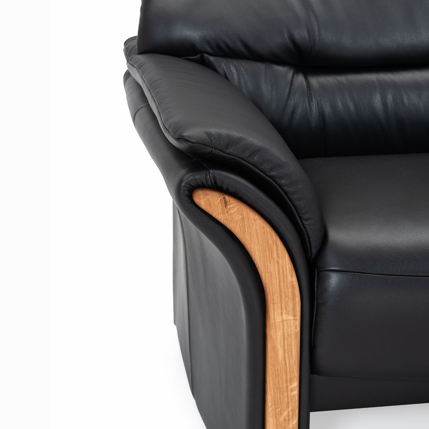 Det sorte semianilinlæder giver sofaen et eksklusivt look og er samtidig slidstærkt, så den holder sig smuk i mange år. De bløde sæder og de let buede armlæn med detaljer i olieret egetræ skaber en varm og naturlig stemning i rummet.