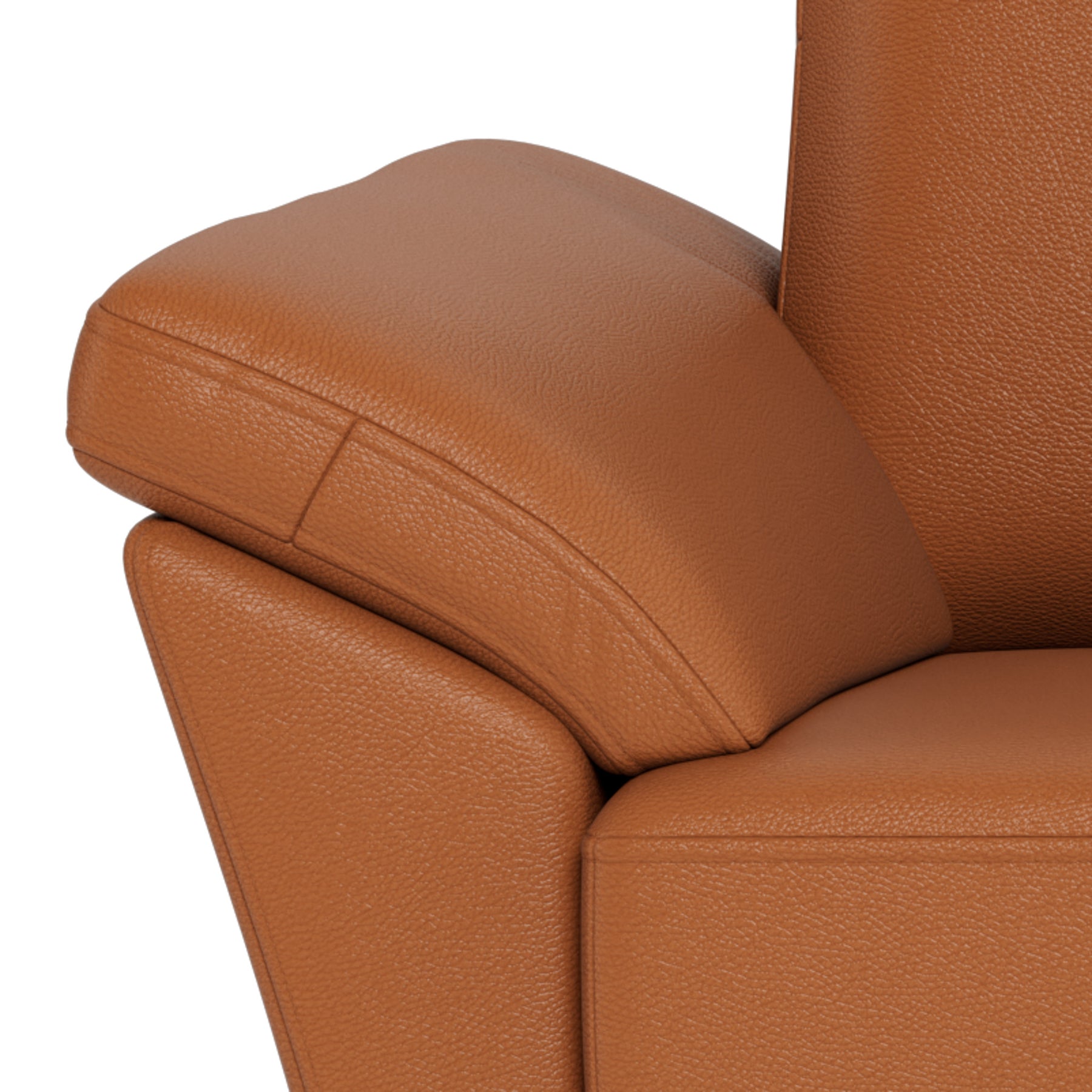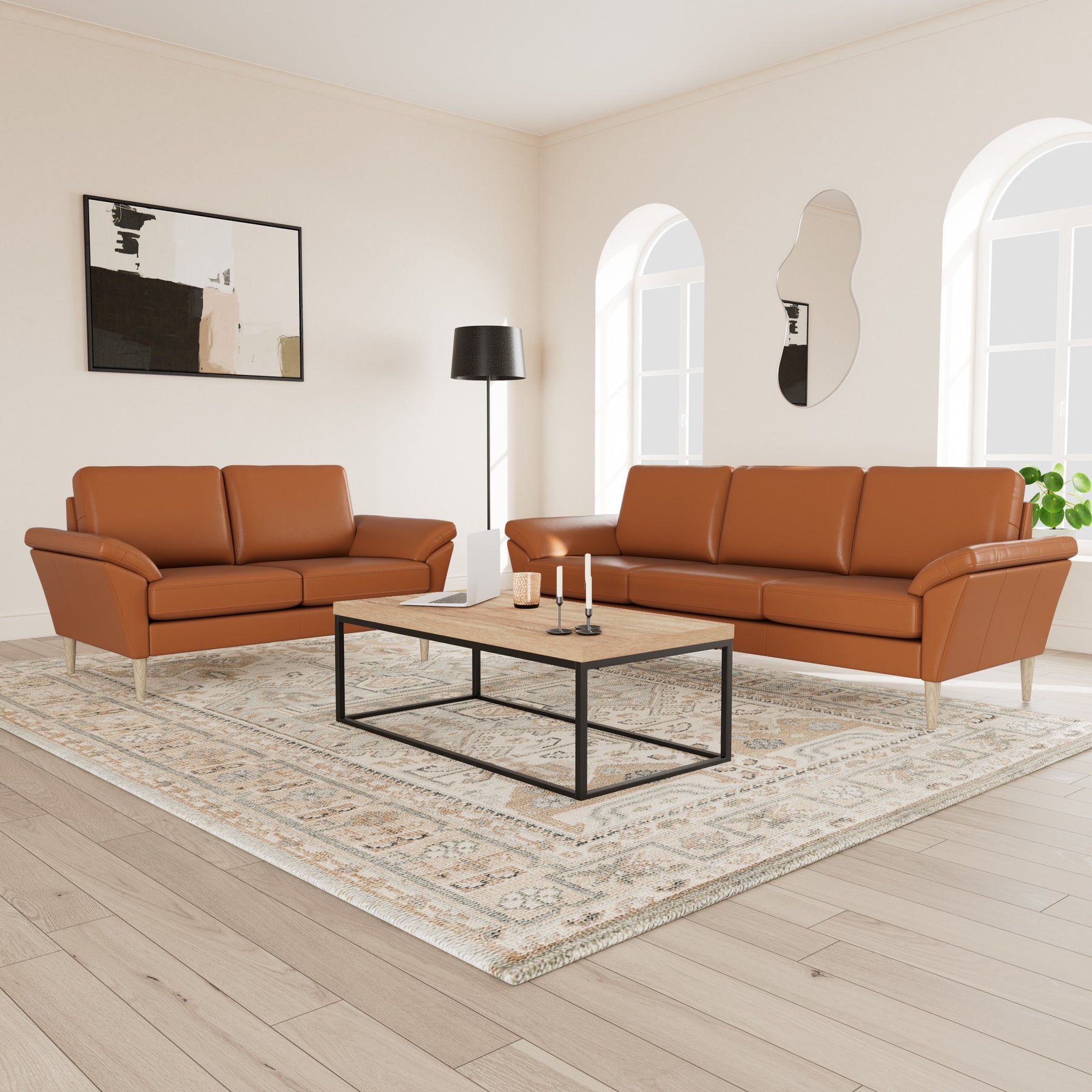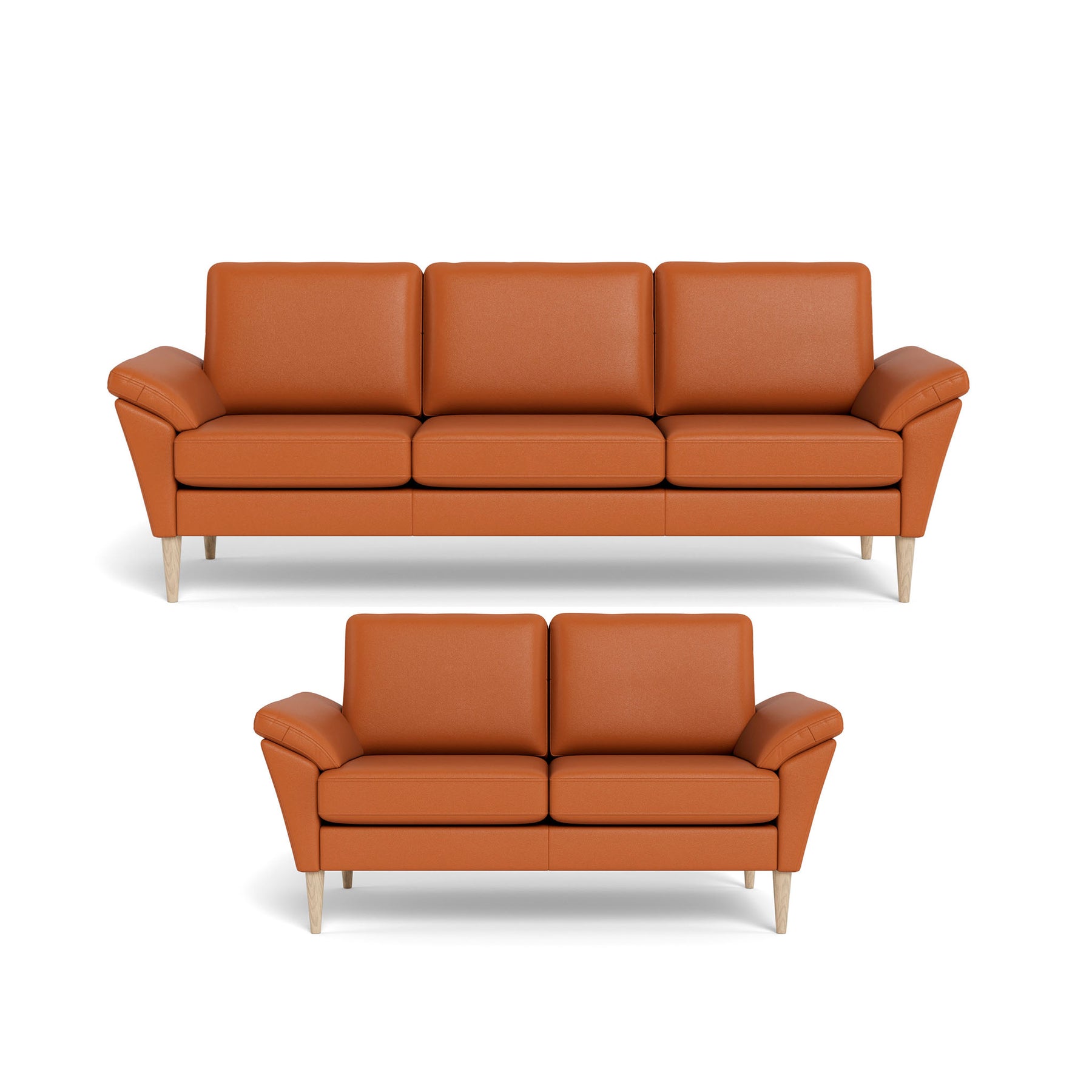 Sofasættet fås i flere stof- og lædertyper samt mange farver. Du kan desuden vælge mellem ben i sortlakeret eller ubehandlet eg. Denne variant er betrukket med eksklusivt cognacfarvet Trend-læder, som forener elegant udseende med høj slidstyrke.