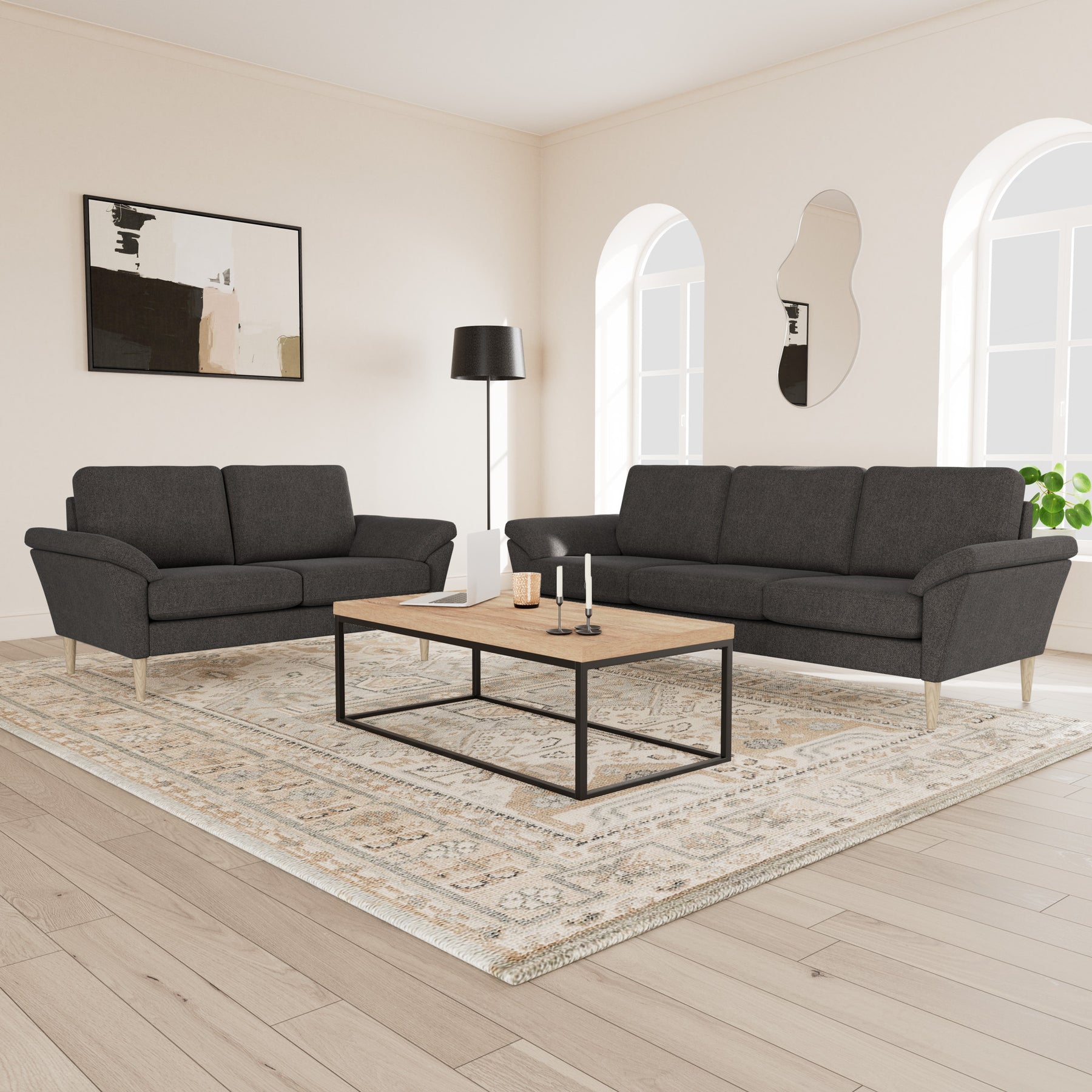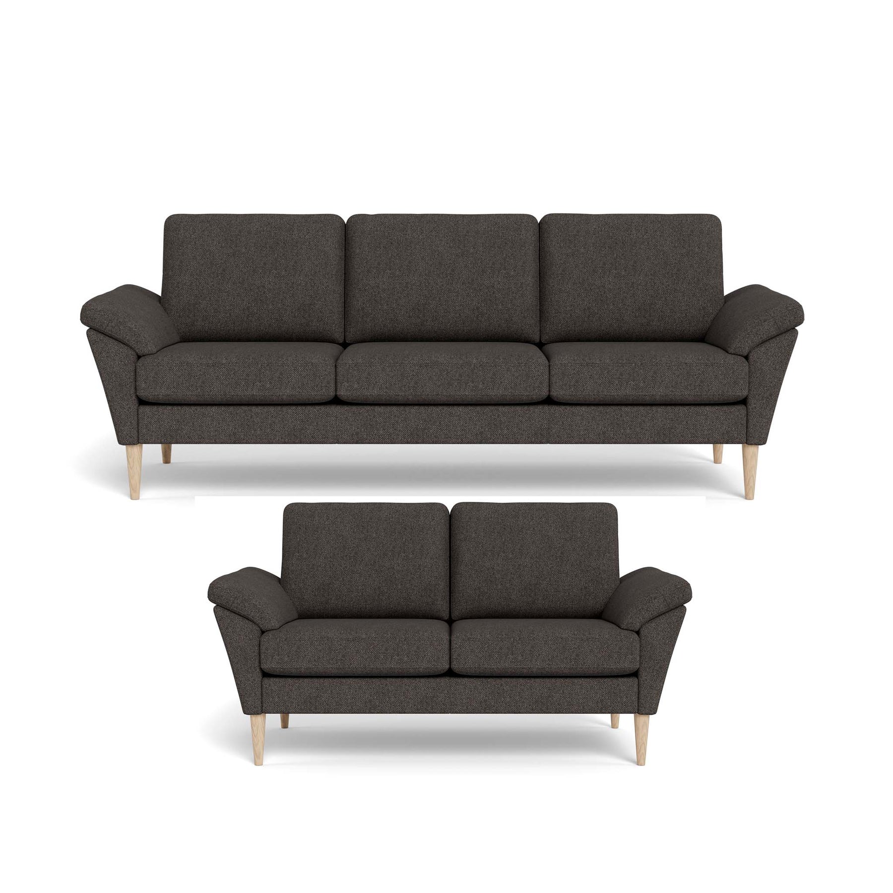 Melby sofasættet kan tilpasses din stil med et bredt udvalg af stof- og lædertyper samt ben i enten sortlakeret eller ubehandlet eg. Her er modellen vist i det slidstærke og bløde Raven-stof – et oplagt valg til dig, der ønsker både kvalitet og æstetik. Her vist i mørkegrå.