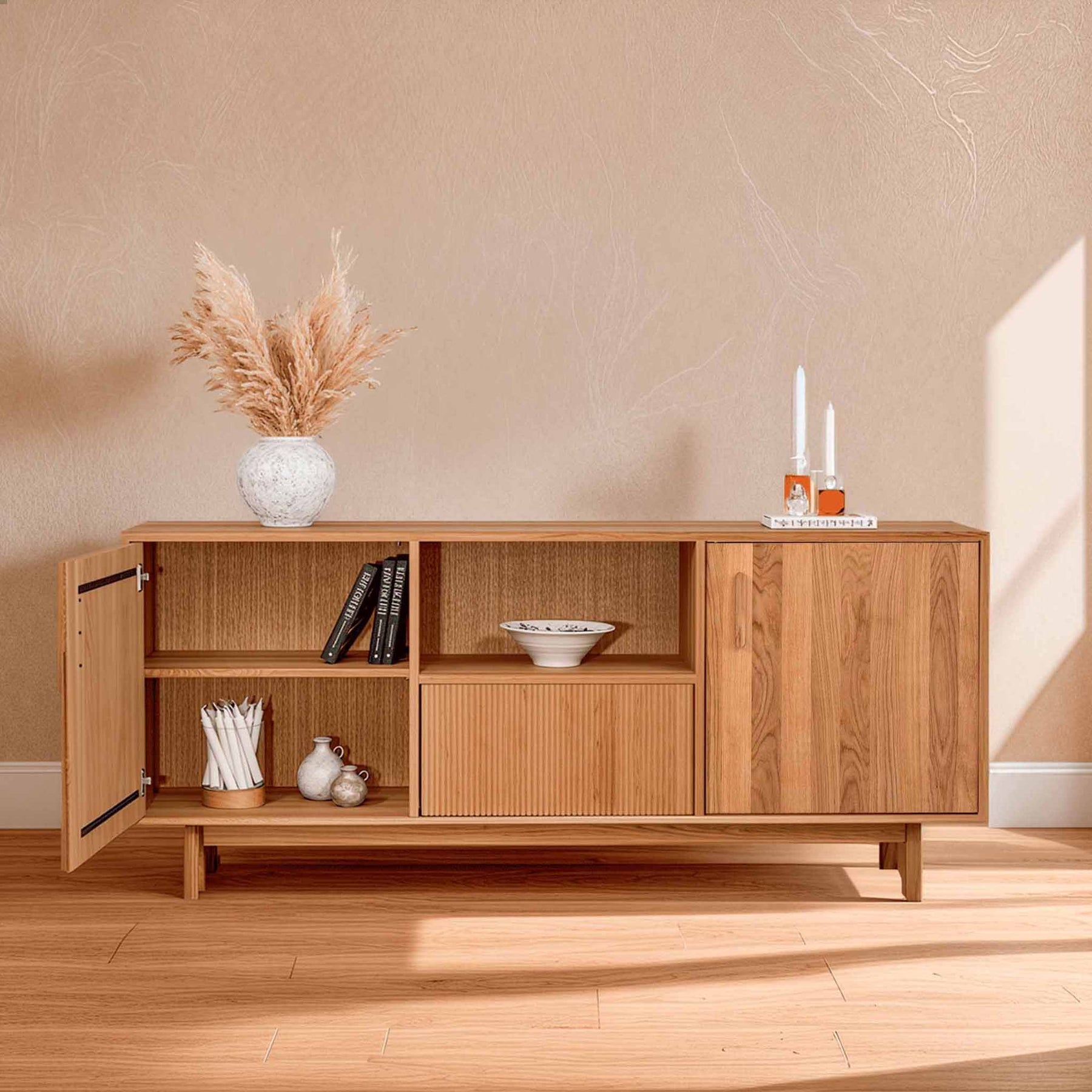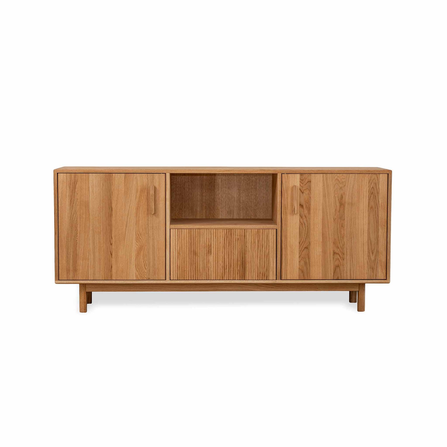 De slanke træben og enkle trægreb fremhæver det nordiske formsprog og gør skænken let i udtrykket, så den passer smukt ind i både stue, spisestue eller entré. Bag de tre sektioner finder du god plads til opbevaring, samtidig med at du kan bruge toppen til at udstille personlige detaljer og dekorative elementer.