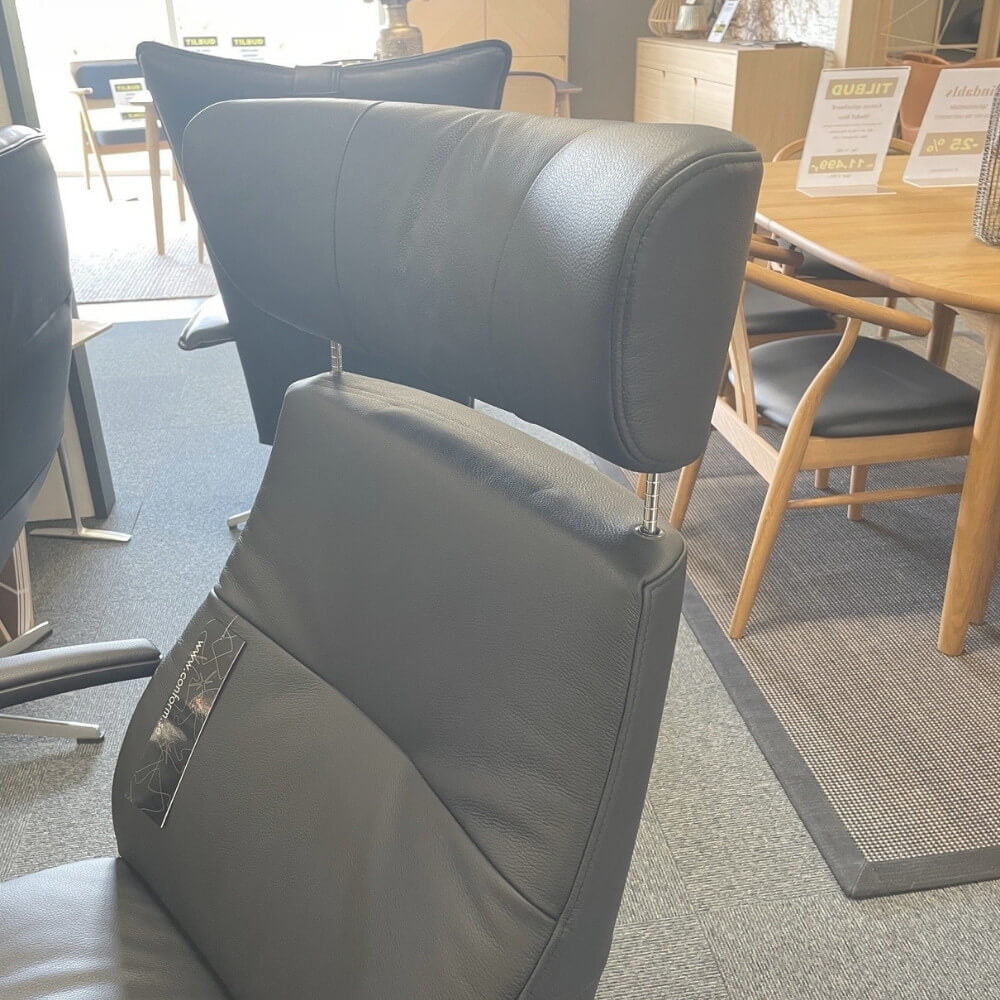 Smuk stol i et elegant og tidløst design fra Conform. Denne lækre lænestol er betrukket med handskeblødt sort okselæder overalt. Sæde og ryg er udstyret med indlæg af formstøbt koldskum, hvilket sikrer god komfort og lang levetid. Lænestolen har en justerbar ryg- og nakkefunktion, så du kan indstille stolen præcis, som du ønsker det. De sorte metalsokler giver stolen et roligt og enkelt udtryk.